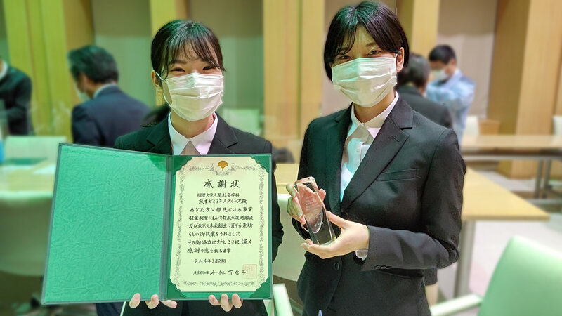 左から 小池百合子東京都知事、藤野真央さん(明星大学人文学部人間社会学科4年生)、福西美友さん(明星大学人文学部人間社会学科4年生)