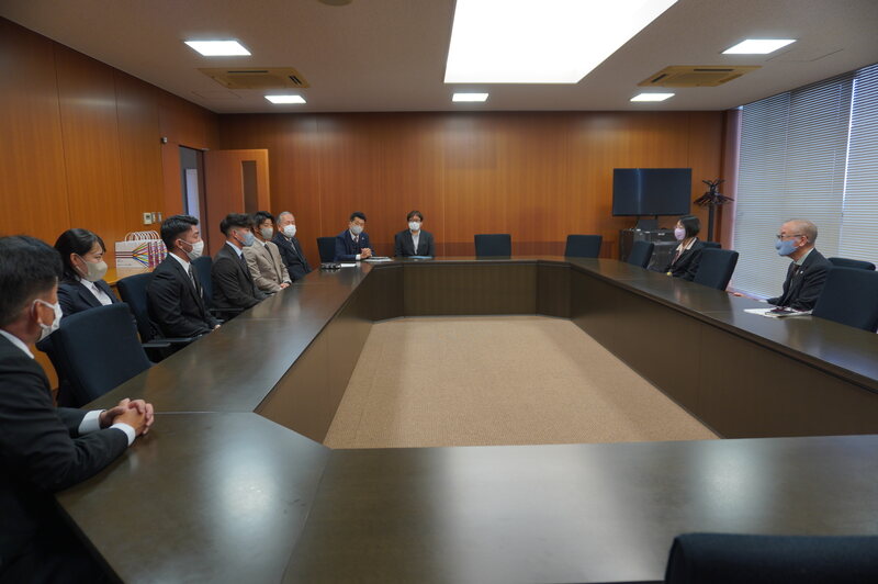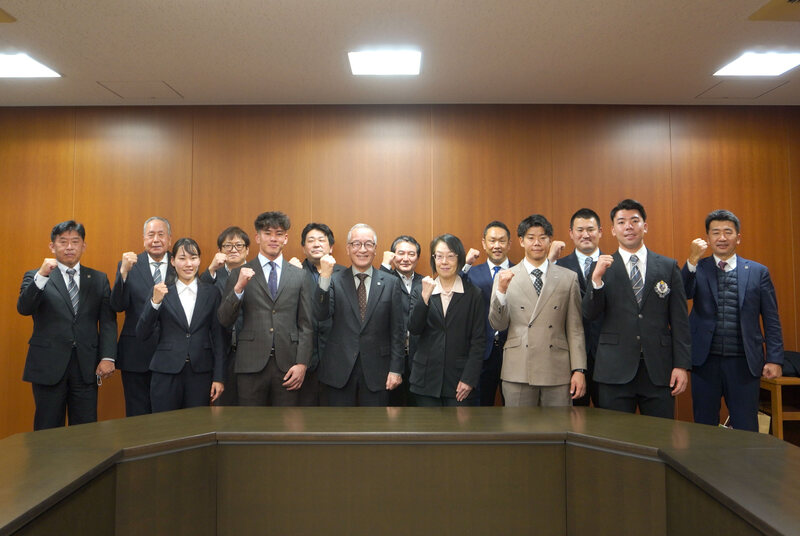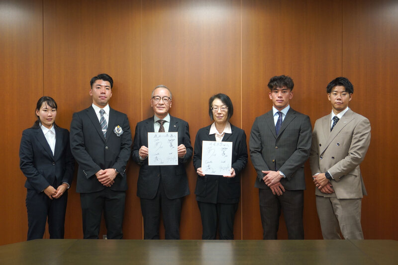 左から 村川選手、松井選手、落合学長、吉川副学長、宮内選手、松原選手。 4選手合同の貴重なサインをいただきました!