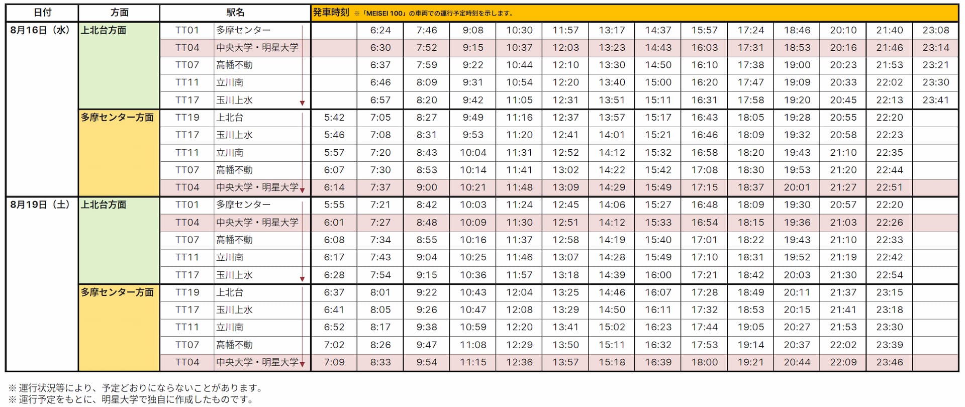 明星大学オープンキャンパスが行われる8月16日(水)・19日(土)は、次の時刻に「MEISEI 100」が運行される予定ですので、オープンキャンパスへお越しの際にはぜひご乗車ください。