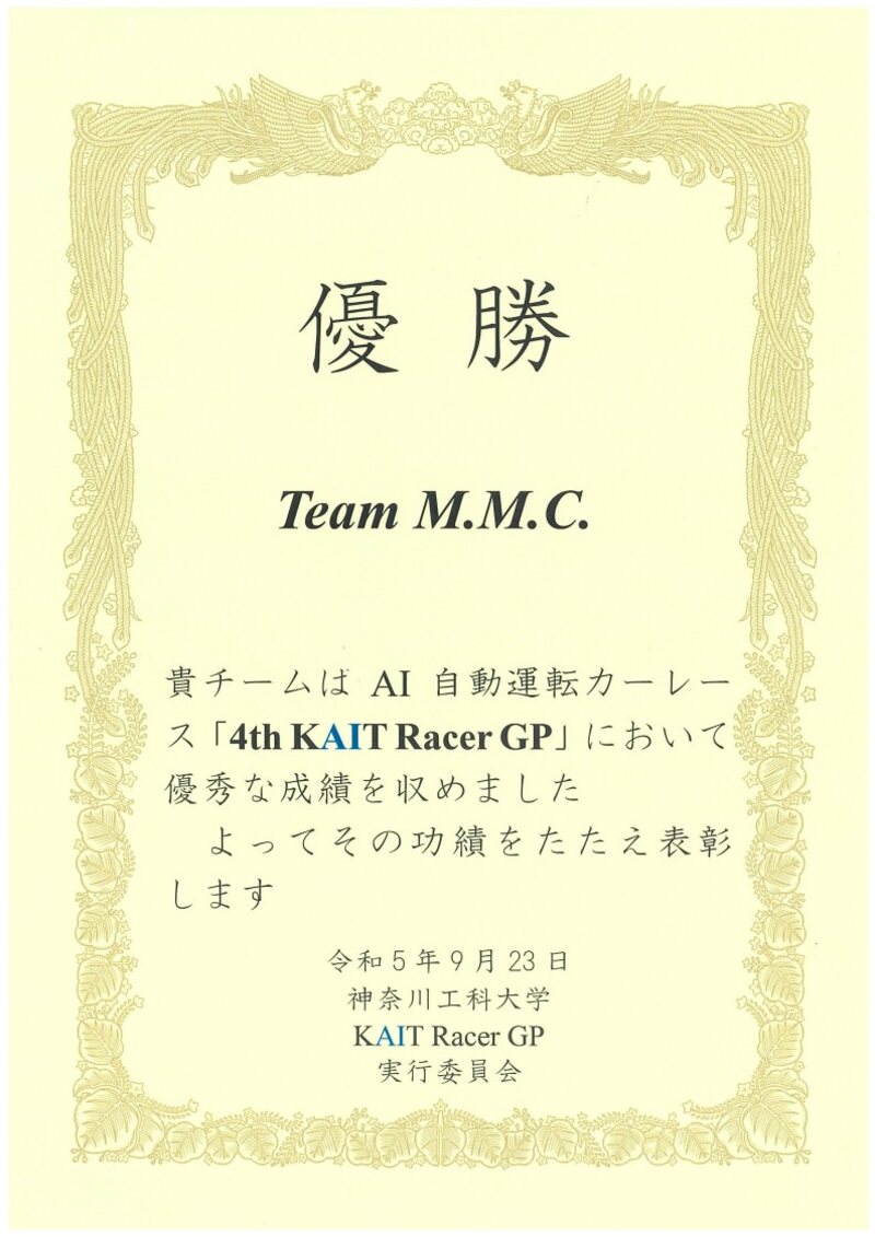 本学学友会愛好会マシン工作サークル(MMC)が、2023年9月23日(土)に行われた、「第4回 『AIが走らせる自動運転ラジコンカーレースKAIT Racer GP』」(神奈川工科大学主催AIカーレース大会)において優勝しました。AIによる走行という、新しいラジコン大会です。