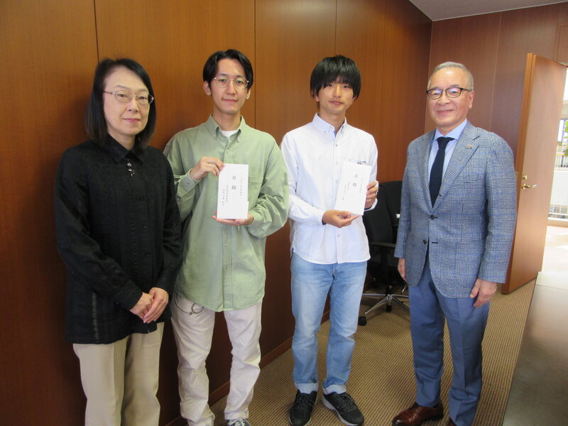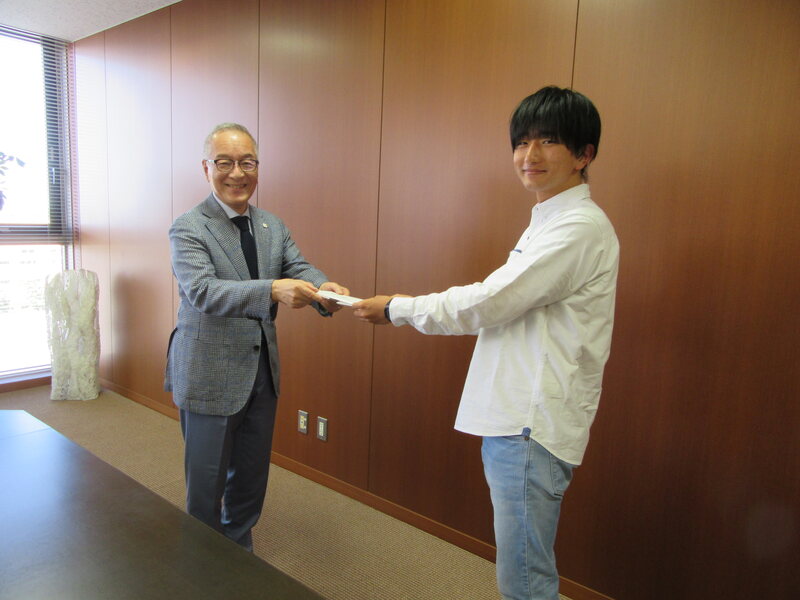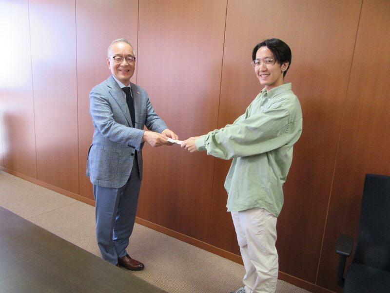 落合一泰学長から、星友祭実行委員会委員長 能登陸生さん(教育学部 教育学科 3年生)と副委員長 野澤伊冬さん(心理学部 心理学科3年生)へ、それぞれ目録が授与されました。頂いた寄付金は、星友祭実施のための費用に充てられます。