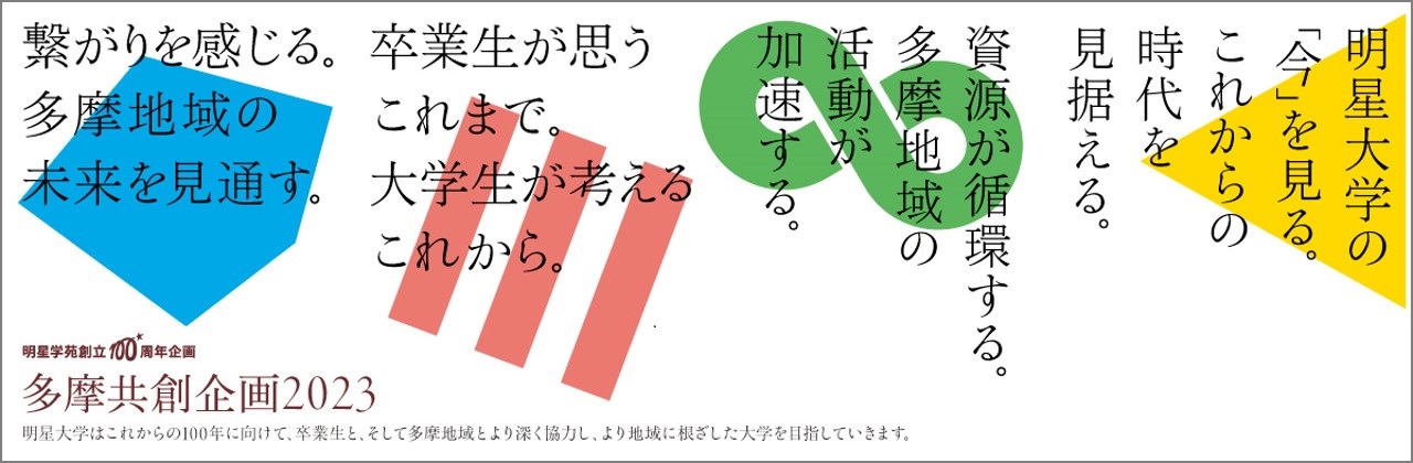 明星学苑が2023年に創立100周年を迎えたことを記念して、明星大学で2023年10月~12月にかけて開催した「多摩共創企画2023」について、明星大学公式noteにて紹介しております。 記事内では、「多摩共創企画2023」で開催した下記の4つの企画をまとめたダイジェスト版の動画もご覧いただけます。