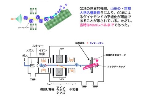 ダイヤモンドジュエリーの研磨は従来のスカイフ研磨(後述)によって手作業で行われ、そのクオリティによってジュエリーとしてのグレード・価格が決まっていますが、本研究で開発したガスクラスターイオンビーム(GICB)加工によれば、最高グレードのダイヤモンドジュエリーに残る研磨傷を消すこともできます(ただし、そもそも研磨傷は肉眼で見える大きさではないので、そのレベルは最先端の原子間力顕微鏡を用いて初めて判別できるものです)。