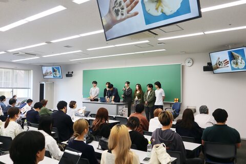 実際の提案には、試作品を作成したグループ、販売場所の拡大を目指し自動販売機やワゴン販売を提案したグループ、ペット用ジェラートの認知度を高めるような商品化や宣伝を提案したグループなど、ペットに与えて良い食材・いけない食材を加味しながら、多様な提案を行いました。その他、ペット用ジェラートは記念日に購入されることが多いことから、記念日だけではなく日常に視点を置いた熱中症対策としての商品を提案するグループもありました。