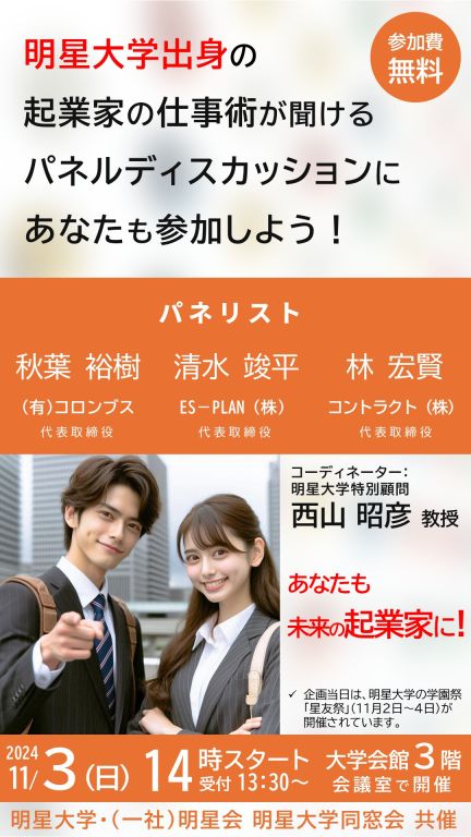 明星大学では星友祭(学園祭)の期間中(11月2日~4日)の11月3日(日)に同窓会(明星会)「All Stars' Day」を開催し、パネルディスカッション「明星大学出身起業家の仕事術」を下記のとおり実施いたします。