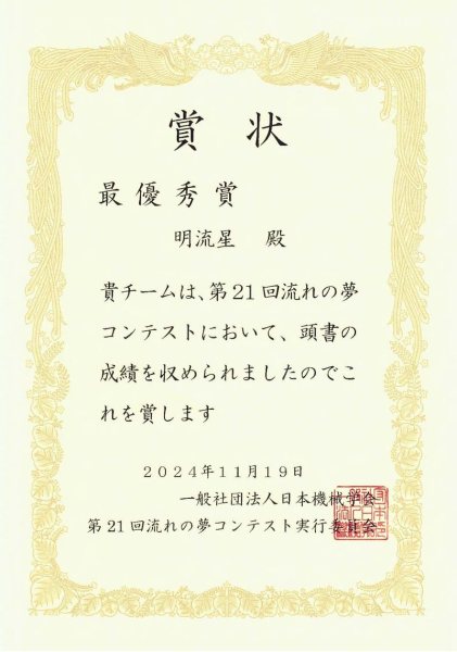 第21回 流れの夢コンテスト「最優秀賞」賞状