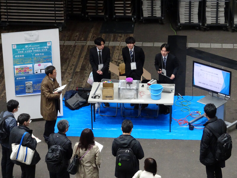 SDGsの項目である「すべての人に健康と福祉を」をテーマに、ウォーターベッド風「癒し機器」を考案し、「世界の人々に癒しを供給できたら」という願いを込めて装置を作成しました。