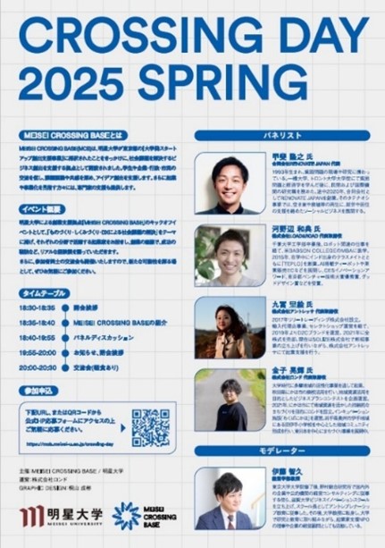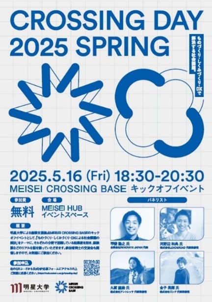 MEISEI CROSSING BASEの目的である「ものづくり・しくみづくり・DXによる社会課題の解決」をテーマに、各分野で活躍する起業家を招き、起業のリアルや魅力、成功の秘訣などを語ってもらうほか、地域の事業者などが抱える課題に学生がチームで取り組むテーマを発表します。また、参加者同士が気軽に語り合える交流会も開催します。
