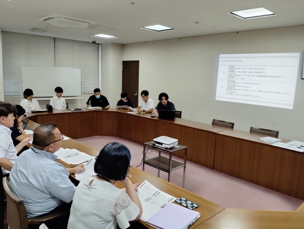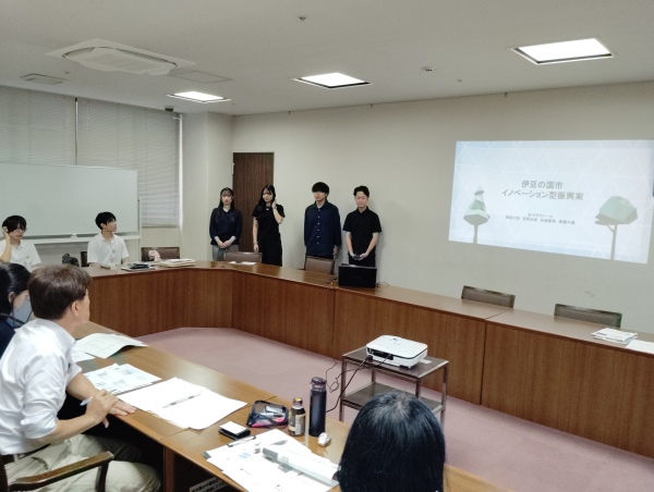 ゼミ合宿2日目の当日は伊豆の国市長岡総合会館において、伊豆の国市産業部観光文化課様、伊豆の国市観光協会様、伊豆長岡温泉旅館協同組合様の5名様に対して、谷川ゼミ3グループによるプレゼンテーションを行いました。