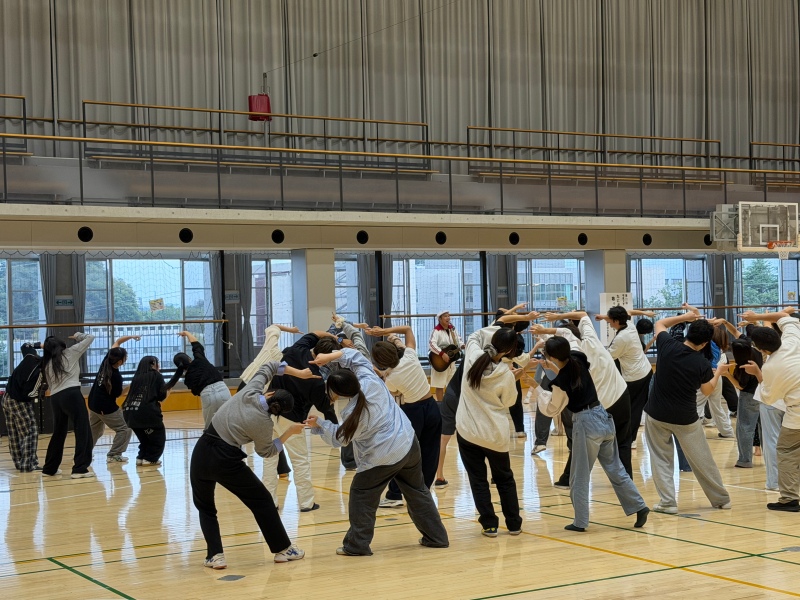最初は表情が固かった参加者の皆さんも“たにぞう”さんの軽快なトークから、段々と顔がゆるんでいきました。みんなで一列になり、“たにぞう”さんの弾き語りに合わせて、「バスにのってゆられている♪」というメロディーに合わせて、右へ左へと身体を動かしていきます。不思議なことに段々と楽しくなって、最後は皆さんが笑顔になっていました。