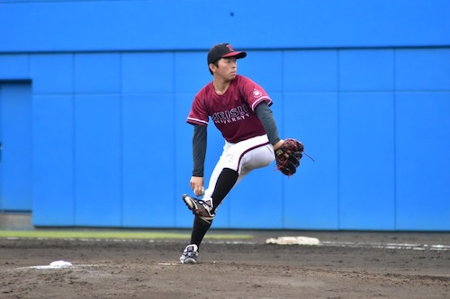 投げては、7回途中から継投した加藤宇(経営学部経営学科3年・堀越)が、勢いのあるストレートを軸に8回までパーフェクトに抑える力投を見せます。