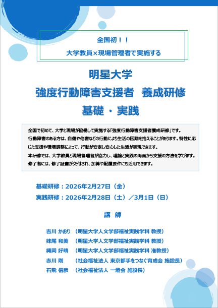明星大学(東京都日野市、学長:冨樫 伸)人文学部福祉実践学科は、2026年2月より「強度行動障害支援者養成研修(基礎・実践)」を開講します。強度行動障害への支援体制強化が求められる中、東京都から認可を受けた研修指定事業者として、大学が本研修を実施するのは全国で初めての取り組みとなります。大学教員と現場管理者が連携し、理論と実践を融合した支援者育成をめざします。