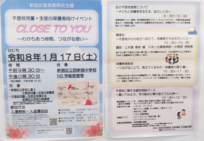 2026年1月17日に、教育学部樋口豊隆客員教授の授業を受講している、教育学部の学生2名が、新宿区教育委員会主催「不登校児童・生徒及び保護者向けイベント~CLOSE TO YOU~」のイベントにスタッフとして参加しました。