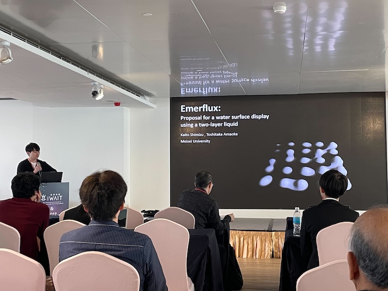 清水さんの発表は、水と油からなる二層液体構造を用い、水面そのものを表示媒体として利用する新しいインターフェースについて報告しました。ポンプ制御により水面にピクセル状の隆起を生成し、文字や図形を動的に表示することで、液体の物理的特性を活かした有機的で柔軟な情報表現の可能性を示しました。