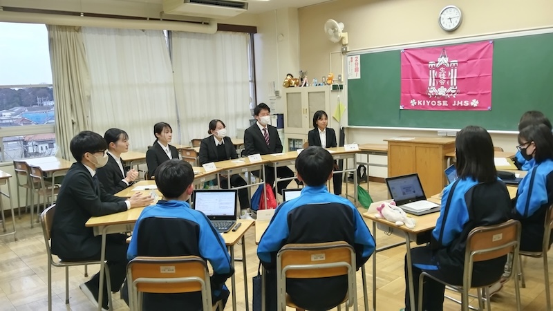 清瀬市立清瀬中学校では、老沼実夏さん(教育学部4年)、山城陽奈さん(教育学部4年)、白井悠悟さん(情報学部4年)、小川みなもさん(教育学部3年)、堺里菜さん(教育学部3年)、島田海大さん(教育学部3年)が参加しました。