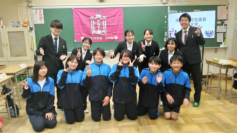 生徒会役員からは「ハートシェアプロジェクト」「清中クラウド」「エコキャップ運動」「グループカウンター」「花の学びやプロジェクト」など生徒会で取り組んでいる多彩な活動が紹介され、本学の学生たちから「すごい、私の中学校ではなかった」など驚きの声が上がっていました。