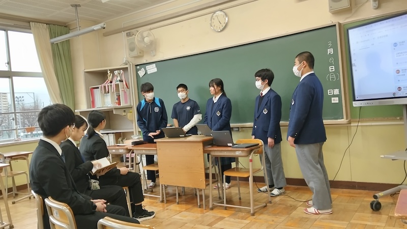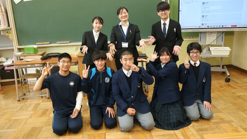 また生徒会役員から、4月の新入生歓迎会では各委員会の活動を劇形式で楽しく伝えたいとの話があり、本学の学生たちは「手話は楽しく学べました。お別れ会で披露することばは思いがこもっていて感動した。劇形式の歓迎会は、わらしべ長者みたいな劇という話があったが桃太郎みたいにしても面白い、ぜひ成功させてください。」と意見を述べ交流しました。