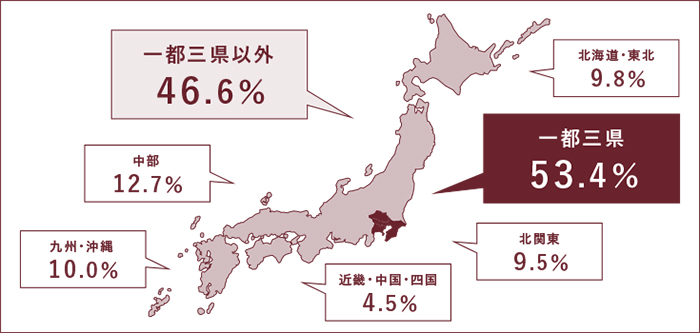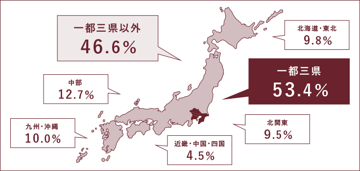 本大学所在地及び一都三県以外の学生が約半数います。