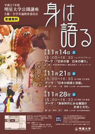 平成27年度全学共通教育委員会主催公開講座は、「身は語る」と題し、下記の通り4回開催します。