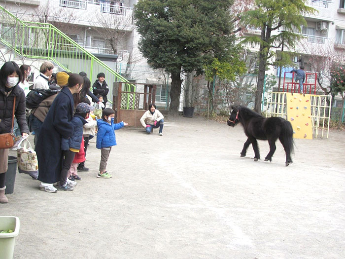 ホースセラピイとして、ジャックとダンディを招き、園庭で二頭の元気なホースが駆け回る姿をみることができました。