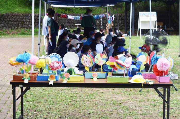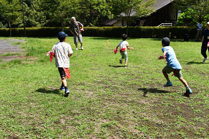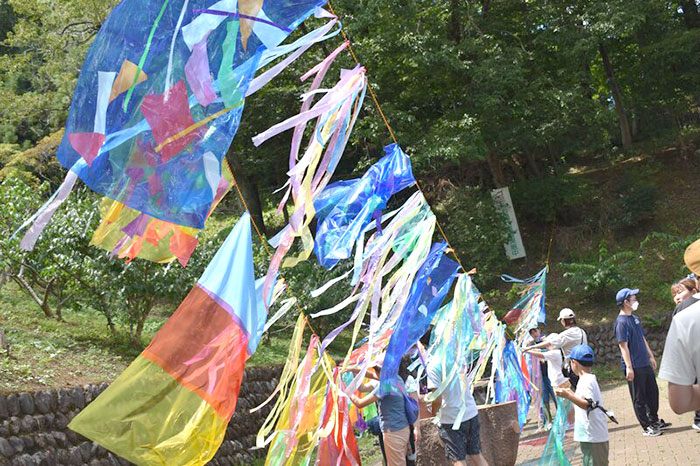 学生たちは子供たちを個別に担当しながら4つの班に分かれてプログラムを行いました。1日目は青梅市成木市民センター体育館で、はじまりの会とドロケイや人間知恵の輪などのレクリエーションゲームを用いてのアイスブレイク、宿泊先の埼玉県立名栗げんきプラザでのキャンプファイヤでは鬼滅の刃をモチーフにしたアトラクションと花火を行いました。2日目は朝から青梅市花木園に移動し、本年度から参加の佐々木敏幸助教による造形ワークショップを行い、皆で作った鮮やかなフラッグが夏の青空に向ってはためきました。午後は3つの課題をクリアしていくスタンプラリーを行い、花木園名物の長さ211メートルのローラー滑り台なども楽しみました。