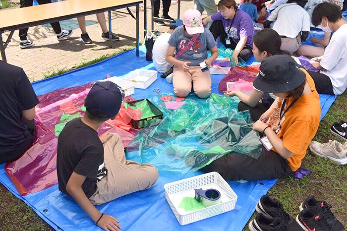 キャンプ本番の午前中はハンカチ染め、花壇作り、ミニパラシュート作り等の工作活動、午後は複数の遊びブース(ポートボール、タッチ鬼、しっぽ取り、ストラックアウト、なんじゃもんじゃ等)を巡るウォークラリーといった学生企画のプログラムを行い、子供たちとともに、笑顔いっぱいに真夏の一日を満喫しました。