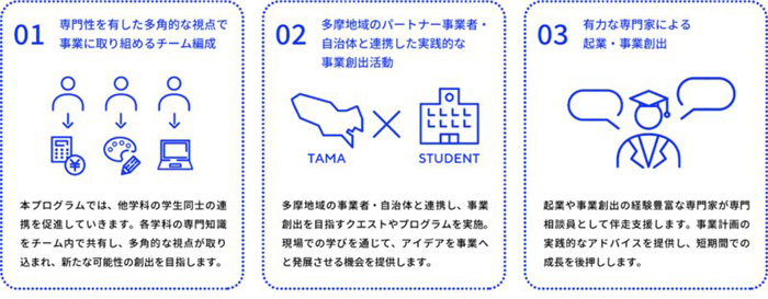 多摩地域の自治体及び事業者の課題と学生をマッチングし、新たな事業創出に向けた取り組みです。本取り組みを通じて、学生たちによる社会課題の発見や事業創出につなげます。