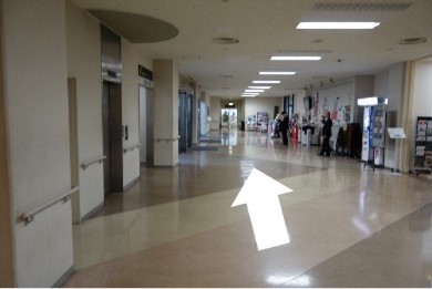自動ドアを入った場所が地下1階です。階段または、奥のエレベーターで1階へ上がってください。